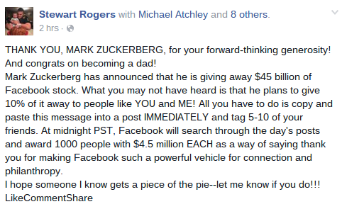 Over the past few weeks or so, there has been a popular hoax that involved Mark Zuckingberg the owner of Facebook. If we like and share the picture then he will give us like 14 million dollars. The only one that was getting rich off of this scam is the ones who came up with the scam to begin with. Those who create these pictures and pages are making huge commissions because we click and like a picture.